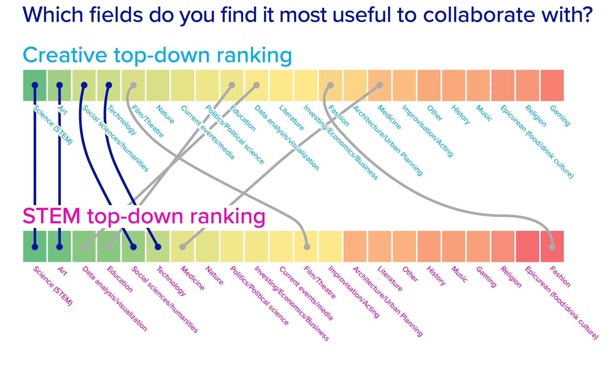 We asked participants to rank the top 3 fields that they find is most useful to collaborate with. “Creative top-down ranking” and “STEM top-down ranking” present the order of responses (from green to red; ascending to descending) by their weighted average. Lines highlight select differences (grey) and similarities (purple) in rankings between Creatives and STEM.