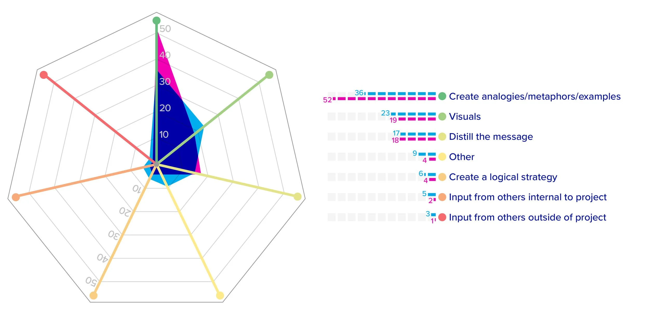 The most used communication strategy was creating analogies, metaphors or examples - rated highest by 52% of STEM participants, and 36% of Creatives (Figure 10). One Creative respondent elaborated on not giving up or finding the perfect metaphor before trying: “Use metaphors that are relevant to your audience, but make sure you know something about the metaphor topic first..start with metaphors you know a lot about, see how they're landing, and adjust. Don't be afraid to toss your metaphor and start from the beginning. SOMETHING will land, and they'll be excited that they understand, not mad at the times they didn't.”