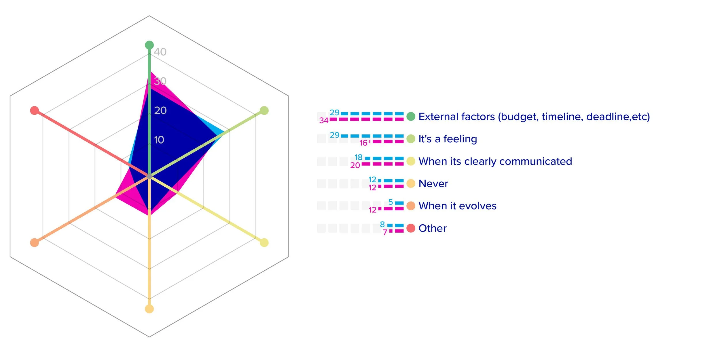 We asked participants how they know when their work/project is complete (Figure 6)? Creatives prioritized “It is a feeling” or “External factors (budget, timeline, deadline, etc)” which are often opposed: an internal gut instinct versus factors imposed upon one by external forces. A Creative stressed the importance of timing: “Being timely is better than being perfect. You can always modify and correct as you go along, but you can't go back and change time. When it comes to communications, perfection is the enemy of completion. If you are late, you are late. Game over…”