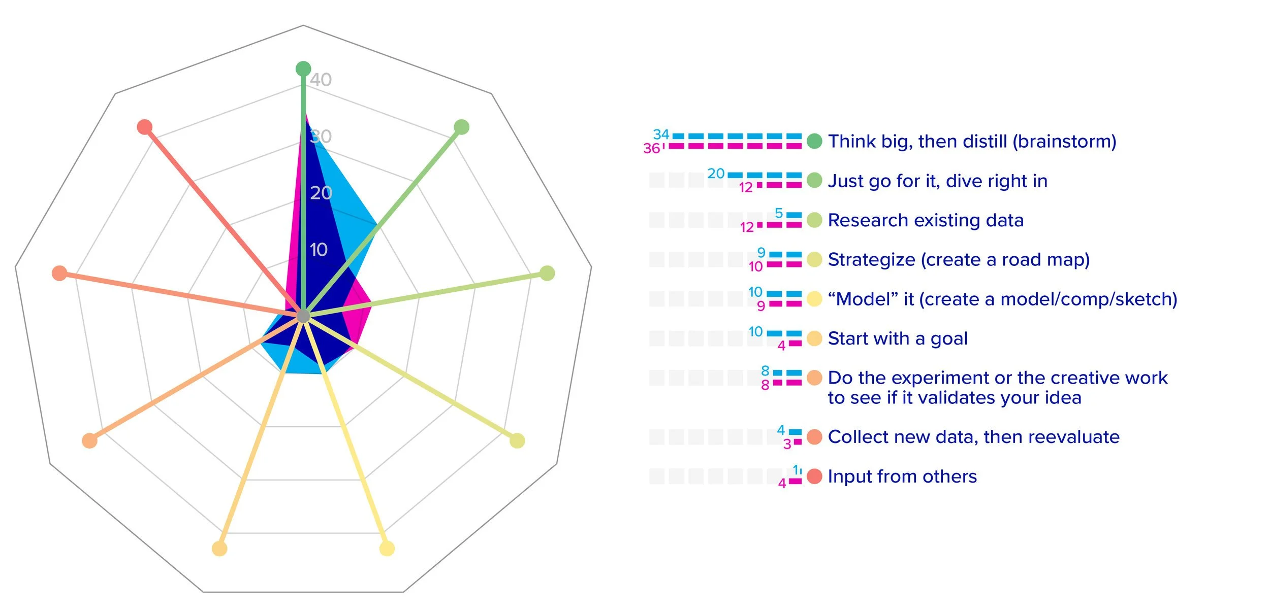 One of the topics we explored was inspiration: Who or What inspires your work? Then we looked at how people develop those ideas, whether they struggle, and how they overcome. Interestingly, Creatives and STEM professionals face many of the same hurdles, as the majority (78% and 72% respectively) reported having trouble coming up with ideas that are relevant to their work (however, it should be noted that we didn’t specify coming up with good or realistic ideas). The number jumps even higher when asked if they ever felt stuck implementing an idea, with the overwhelming majority in both fields identifying with this feeling sometimes (95% Creative; 98% STEM).