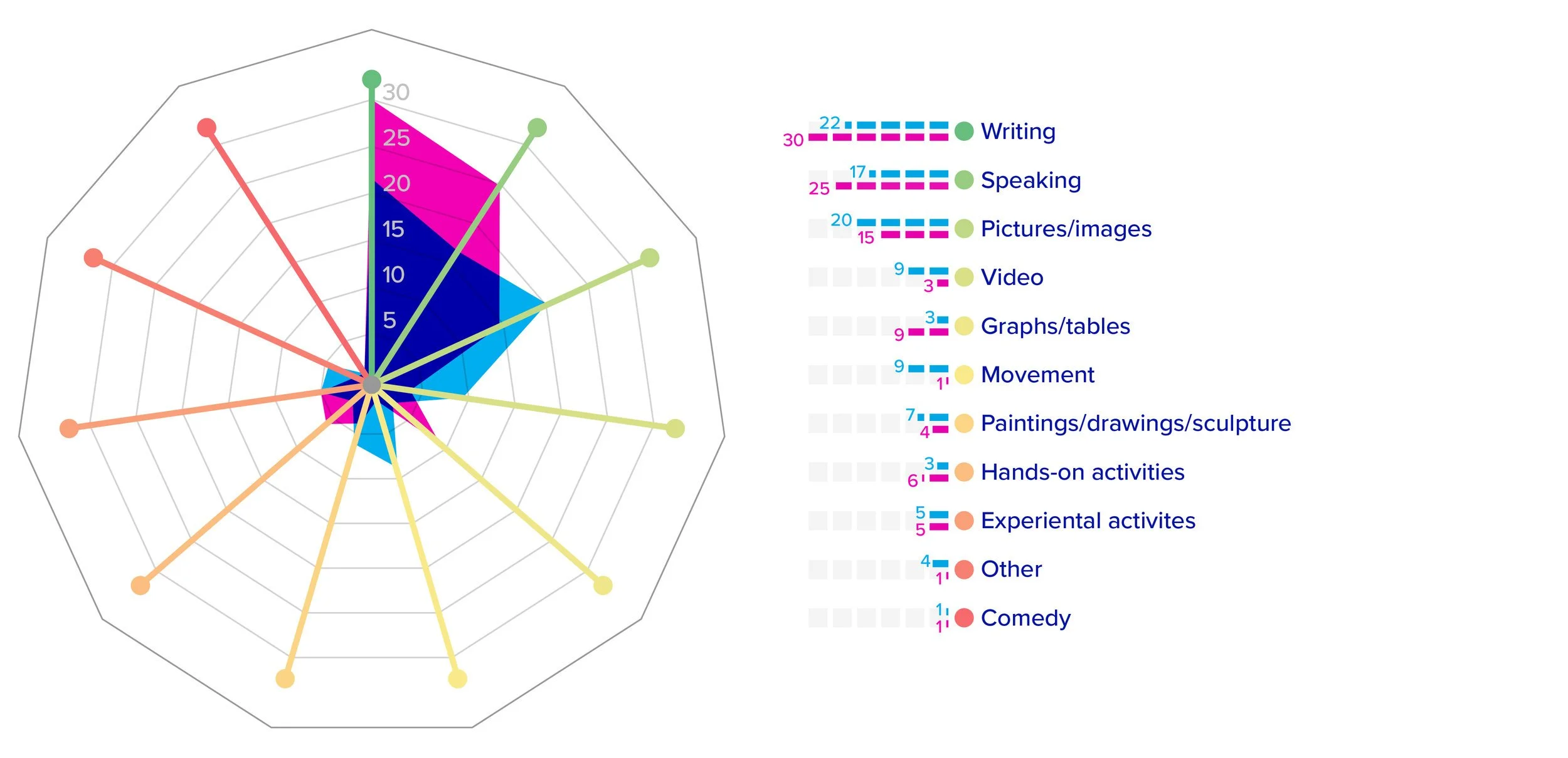 The “Other” category revealed a few interesting outliers: illustration, body language, public art, music and sound, conversation, embroidery, and websites for Creatives; and games for STEM.