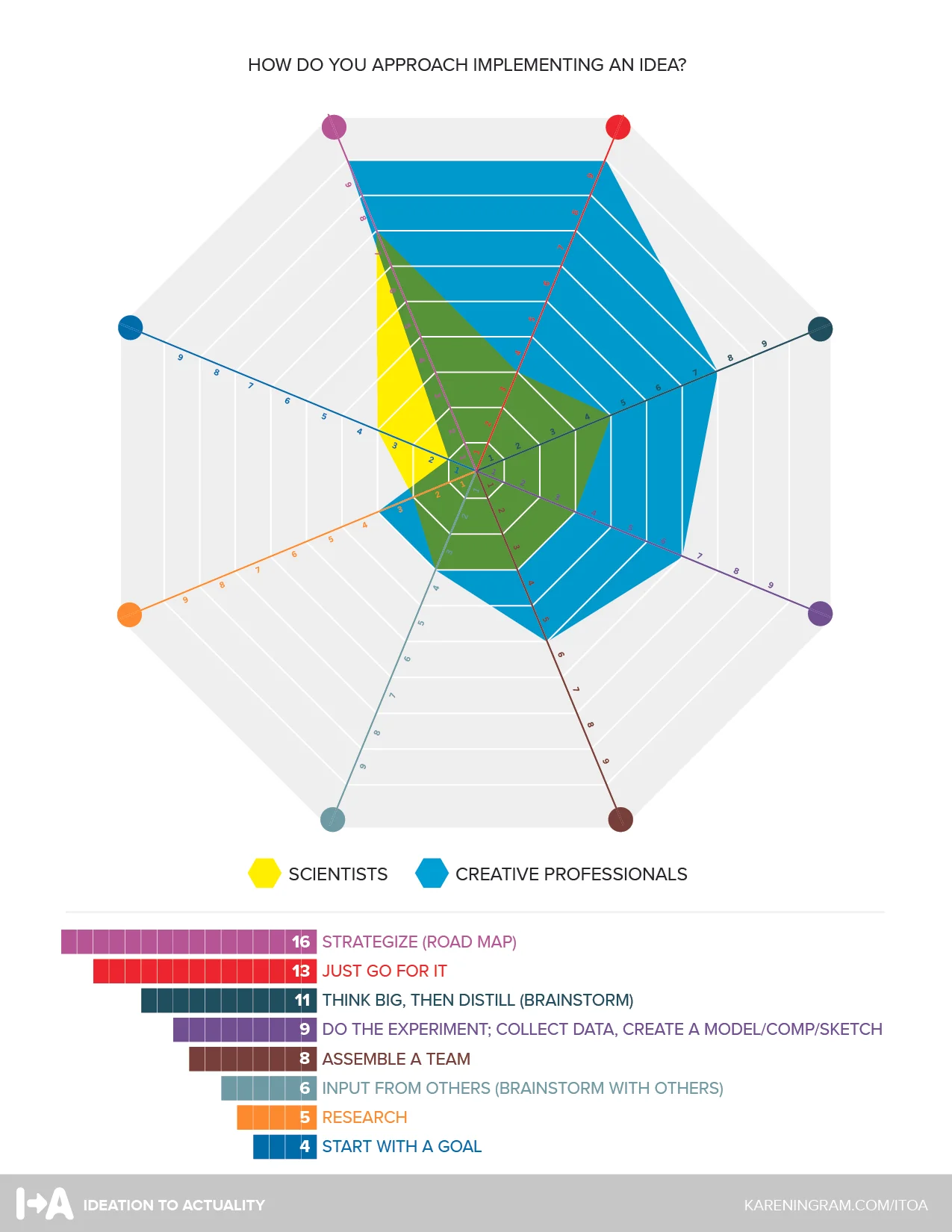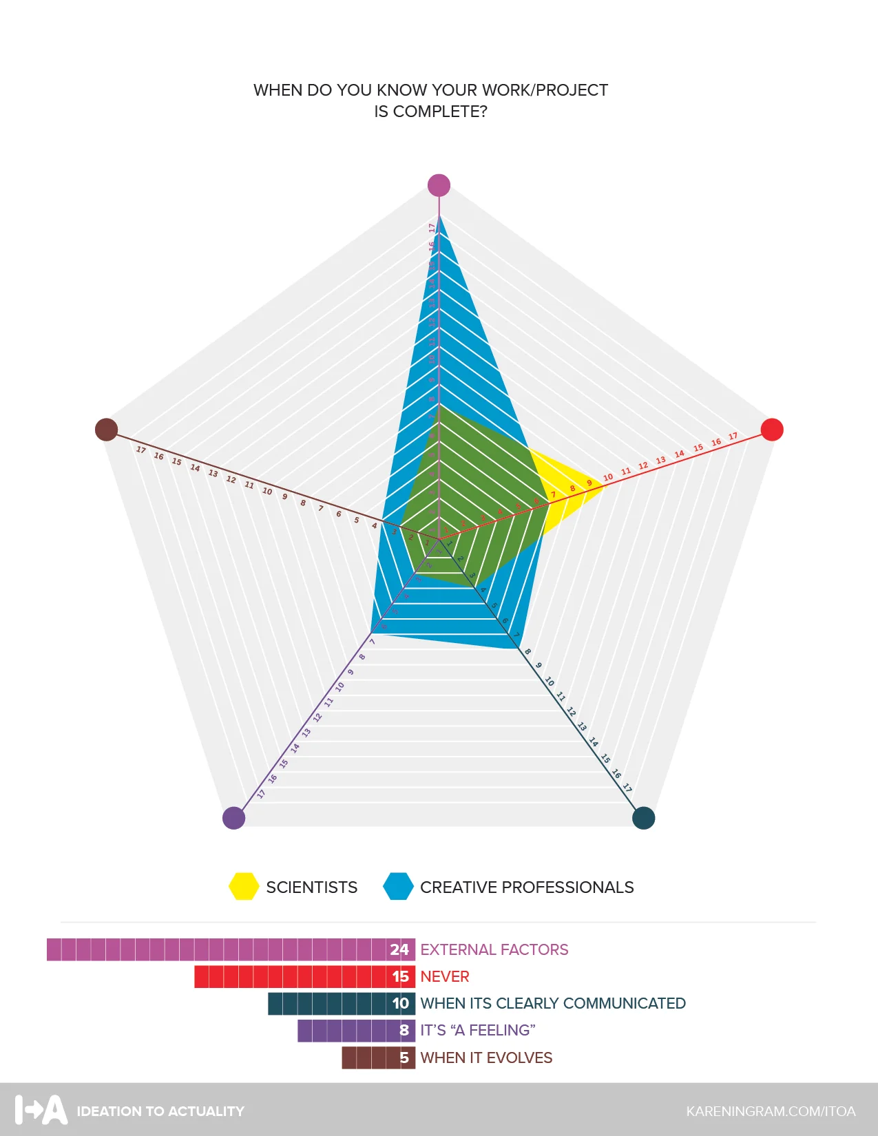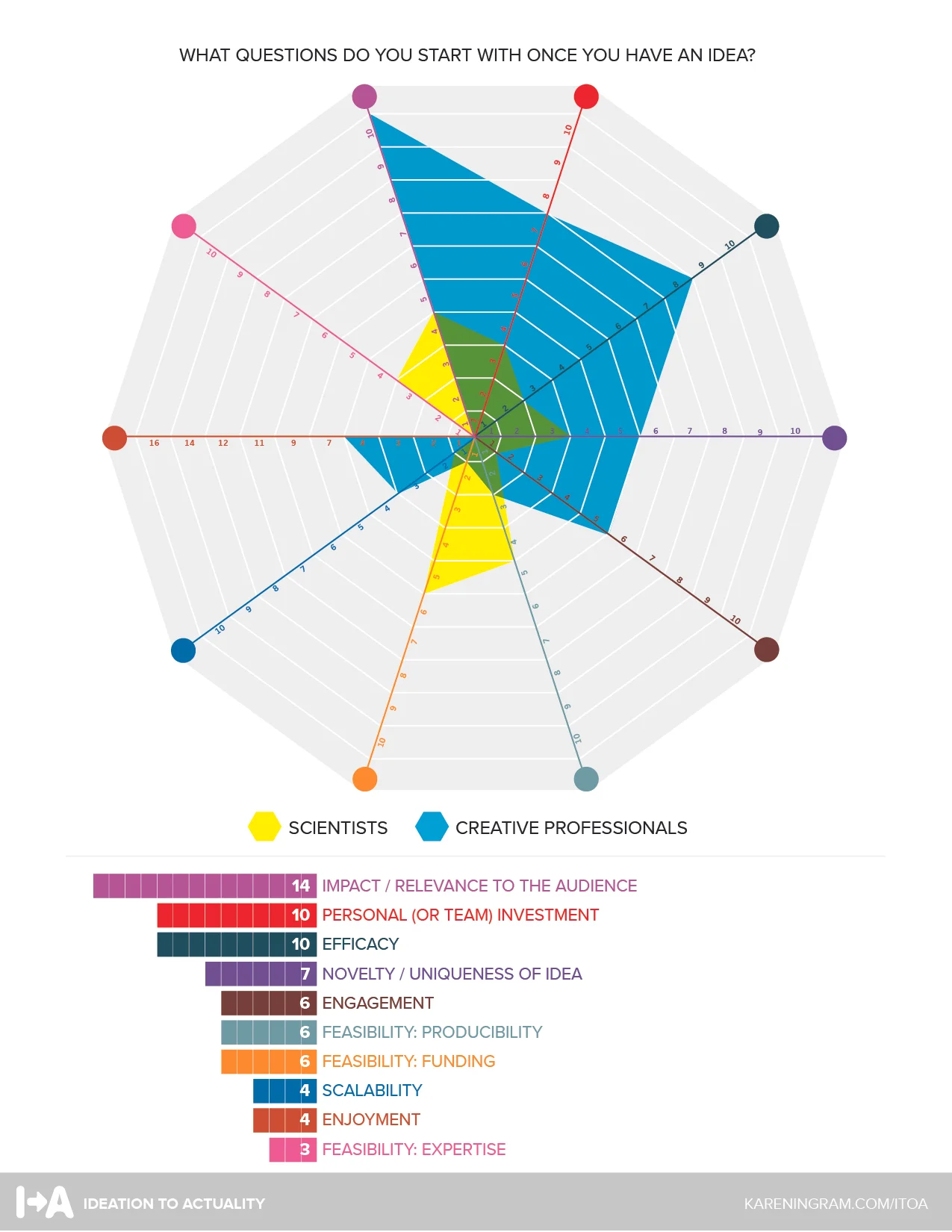 We conducted an initial pilot survey to better understand the relationships between STEM and Creative professionals, and to develop this streamlined survey. Some of the results are shared here. We discovered lots of fascinating similarities, but also intriguing differences, for example, in answering "What do you do when you get stuck?" we received two charming contrarian answers; "...I always stop when I have a little bit left to write. That way, the next time I try to get started, there's always some easy low-hanging fruit waiting to be written.” from a Physics Postdoc. Conversely, a Copywriter, Director of Digital Creative claims when they get stuck, they “Eat the frog. Do the worst part first."